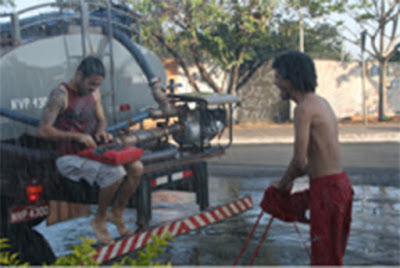 Toda logística exigiu um estudo prévio, multidisciplinar que foi dividido organicamente entre o grupo: reconhecimento sócio/geográfico do locus, orçamento do carro-pipa, duração da chuva, locomoção dos membros dentre outros. Soma-se, divide-se, multiplica-se, se aprende com a troca, com a antecipação coletiva de uma ação: uma pedagogia que se baseia rizomática, que permite relações verticais e horizontais. Sem um delineamento entre as hierarquias internas e externas ao grupo. Percebe-se, aqui, a necessidade de concatenação dos membros do grupo, a capacidade de jogo coletivo, a capacidade de percepção do espaço, do tempo e do publico.